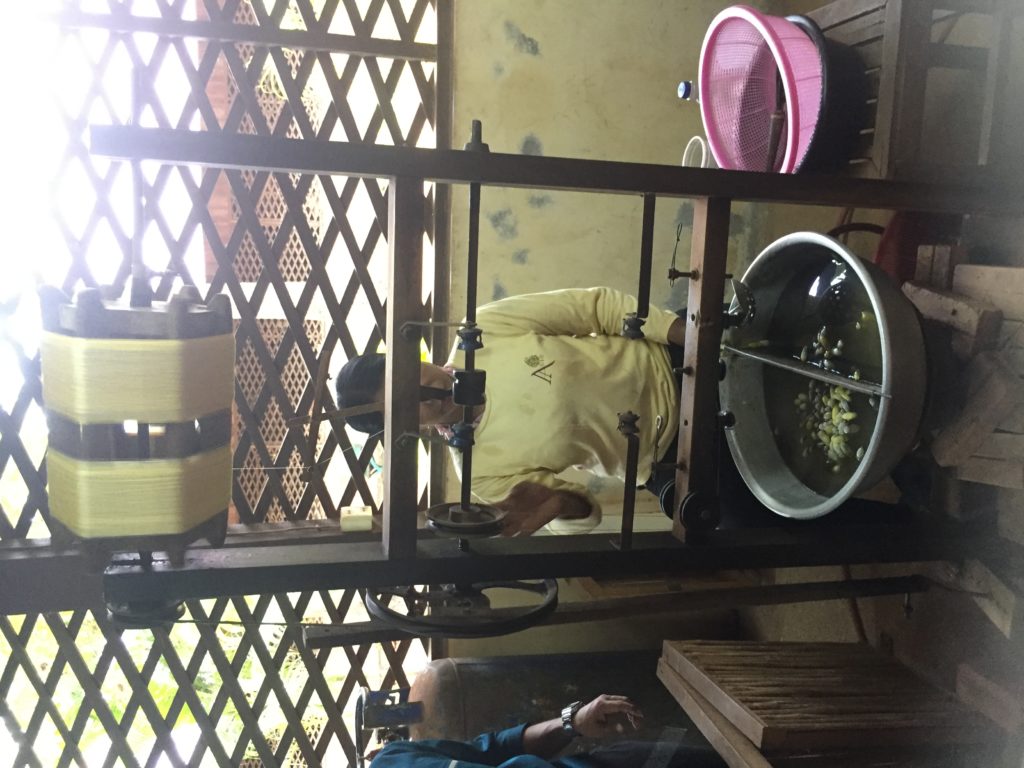 Silk worms feeding on mulberry leaves Months and the cocoon Month coming out of the cocoon Making the thread from the cocoon 200 thread count combing the thread for 200 thread count Preparing the threads for dying